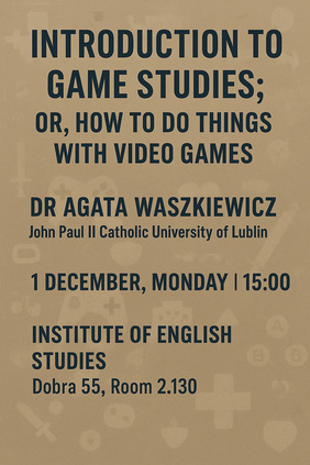 We would like to invite you to a guest lecture delivered by dr Agaty Waszkiewicz from the John Paul II Catholic University of Lublin to a lecture in game studies. The lecture will take place on the 1st of December in room 2.130 on Dobrej 55.